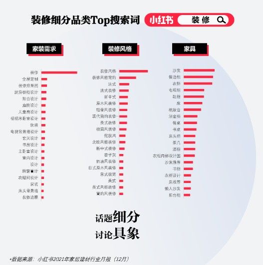像“妙屋小天地”“家装坦白局”“我家的窗景”等众多家居场景化的话题,让用户畅言自己的生活理念,分享家居生活。在小红书搜索装修、家居有关的内容,从原木风、日式、新复古、轻奢等热门风格,侘寂、盐系这样的新兴家装美学的花式风格,到家居装修的细节,从沙发到阳台柜的各种宝藏好物,都有大量的人在讨论和关注。