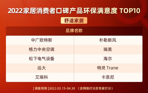 本次荣登《2022家居消费者口碑调查-产品环保口碑上榜品牌》中的有中广欧特斯、朴勒新风、格力中央空调、瑞美、海尔、松下电气设备、特灵Trane、远大、艾瑞科、卡洛尼共10家企业。