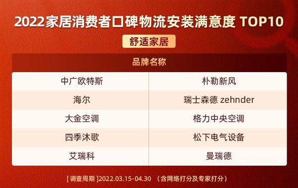 本次荣登《2022家居消费者口碑调查-物流安装交付口碑上榜品牌》中的有中广欧特斯、朴勒新风、海尔、瑞士森德zehnder、大金空调、格力中央空调、四季沐歌、松下电气设备、艾瑞科、曼瑞德共10家企业。