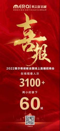 6月6日晚7点30分,“潮奢大牌,岩选美尔奇”美尔奇岩板全国线上直播招商峰会正式开启。在2个小时的时间里,3000+意向客户涌入直播间围观打call,共同见证了这场盛会。在美尔奇强大的企业实力背书和重磅招商政策吸引下,最终60个城市被锁定名额,此次美尔奇直播招商峰会获得圆满成功!