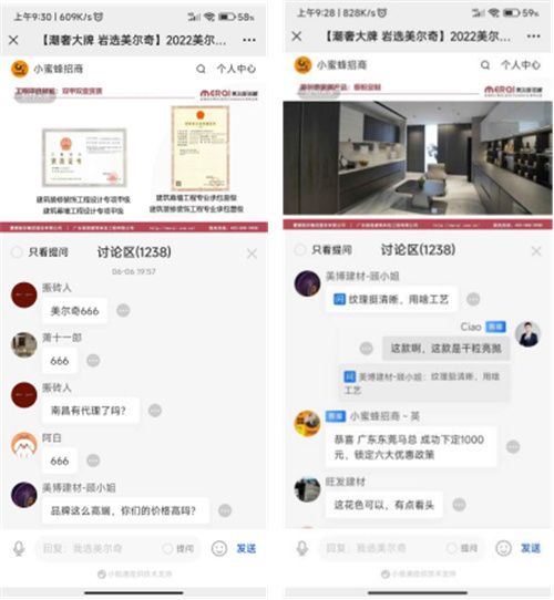 疫情之下,选择一个有实力、有资源、有前途的岩板品牌对经销商来说非常重要。作为蒙娜丽莎集团旗下的潮奢岩板品牌,美尔奇围绕“潮奢”品牌主张焕新出发,重构“岩定”生活空间,在研发智造、产品创新、营销赋能、全案交付、智能门店等方面都有极为突出的优势,不少客户被美尔奇的品牌实力所吸引,纷纷留言咨询品牌、产品详情,直播间顿时热闹非凡,不时有客户成功锁定区域的消息传来。