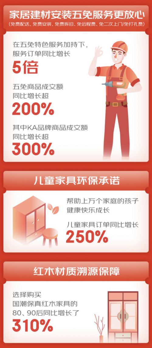 《报告》显示,如今的家装消费早已从“装修难”到“享服务”趋势的嬗变,呈现向全链条服务发展的态势。今年京东居家618期间,以免费配送、 免费安装、免费拆旧、免远程费、免二次上门/免打孔费为内容的“五免”特色服务,带动服务订单同比增长5倍、 “五免”商品成交额同比增长超200%,其中KA品牌商品成交额同比增长超300%。