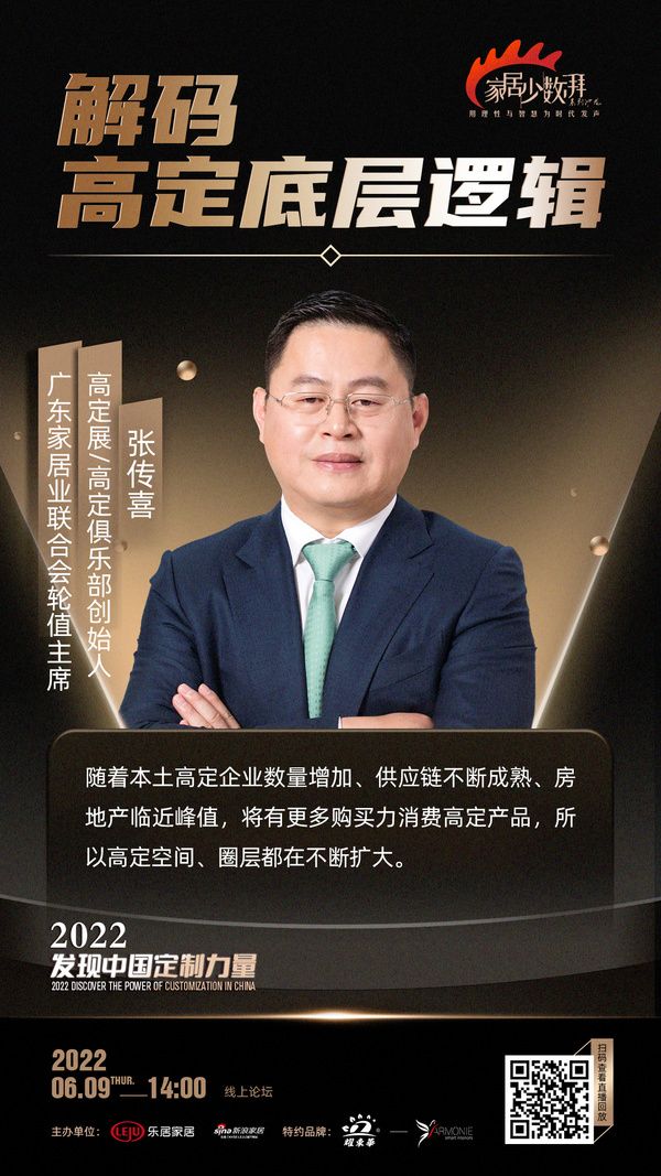 新浪定制频道讯 6月9日,「发现中国定制力量——解码高定底层逻辑」线上论坛正式启动。高定展张传喜在论坛中表示发表了自己的观点:随着本土高定企业数量增加、供应链不断成熟、房地产临近峰值,将有更多购买力消费高定产品,所以高定空间、圈层都在不断扩大。