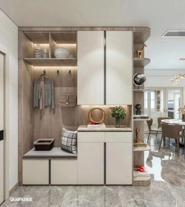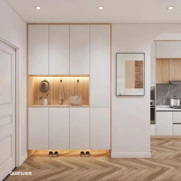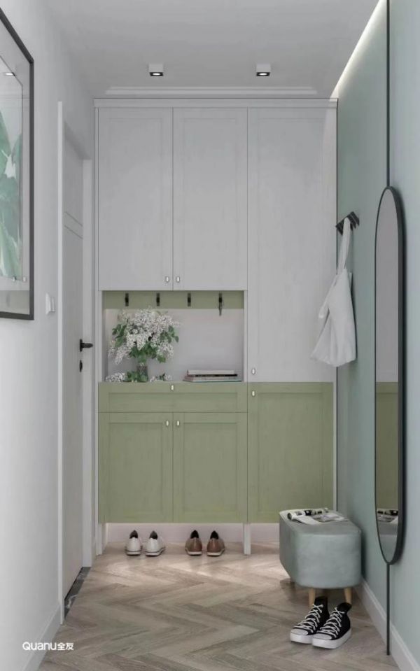 玄关柜中部留空,进出门可以随手拿放钥匙、雨伞等物品,不用再因为丢三落四而困扰。底部留空15cm左右,方便收纳和更换频繁穿着的鞋子,而且鞋子还会被柜体遮挡,让入户处更显干净整洁。