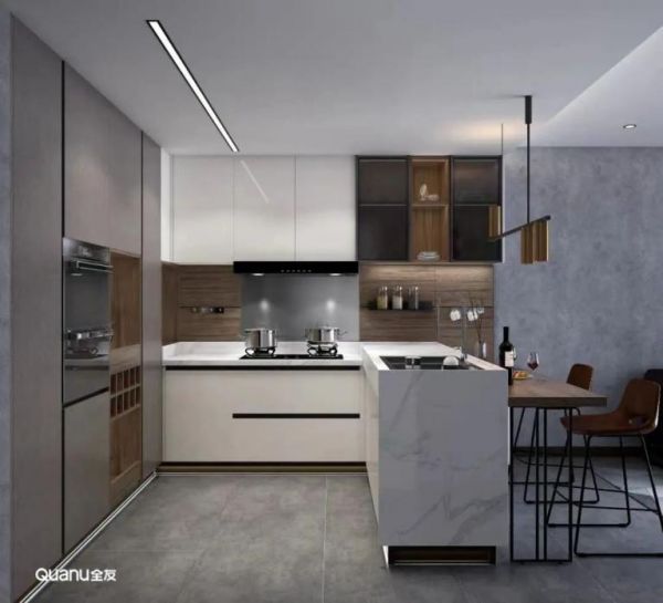 同样高度的厨房台面虽然看起来整齐统一,但使用起来会发现其潜藏的缺点:洗菜时长时间弯腰,或炒菜时长时间抬胳膊,腰背手臂都会酸痛难受。我们可以将水槽区和烹饪区分区,台面连接处营造10cm左右的高度差,动线合理,还能提升操作舒适度。