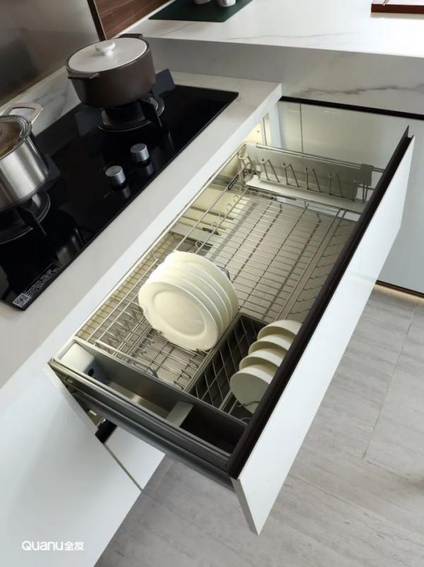 厨房功能五金的好处数不胜数。拉篮、转篮可以帮助我们快速方便地拿取餐具,无需下蹲翻找;墙面五金可以收纳台面上杂乱无章的调料瓶和烹饪工具,降低了瓶罐打翻的可能性;吊柜系统的功能五金则可以提高顶部空间的使用频率,让物品拿放更方便。