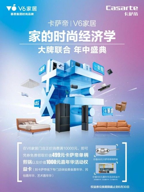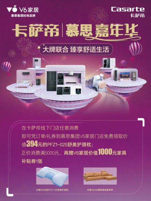 值得一提的是,此次慕思集团V6家居和卡萨帝两大品牌携手打造的“家的时尚经济学”活动,致力于为全国消费者带去既时尚又经济的品质生活新体验。活动期间,推出了一系列专属服务及权益。凡是在卡萨帝线下任意门店消费,即可凭订单/礼券到慕思集团V6家居免费领取舒美护颈枕1个;正价消费满5000元,再赠V6家居1000元家具补贴券1张;在V6家居门店消费满10000元,即可凭礼券免费领取价值499元卡萨帝单柄煎锅1个及价值1000元的嘉年华活动权益卡1张。从内容到形式,从线上到线下,全国门店均可适用,活动范围之广、推广力度之大令人咋舌,势必会掀起一波消费热潮。