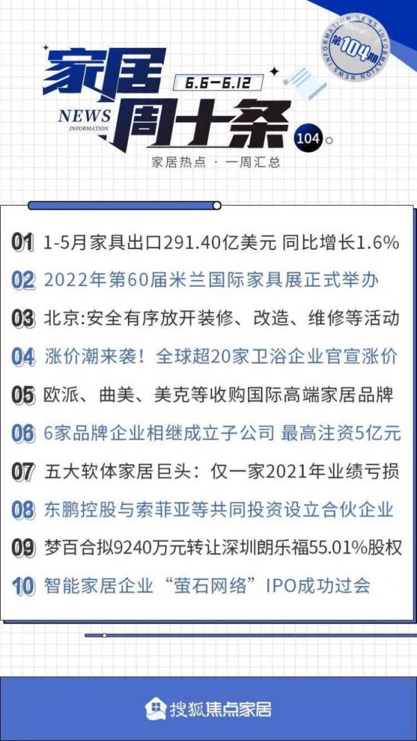 家居周十条丨第60届米兰家具展举办、1-5月家具出口291.4亿美元…
