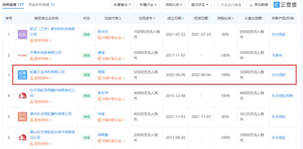其中,东方雨虹新增投资企业虹嘉工业涂料有限公司,东方雨虹持有其100%股权。据查阅,虹嘉工业涂料有限公司成立于2022年6月6日,法定代表人为高丽,注册资本为5亿元,经营范围含信息技术咨询服务;市场营销策划;包装材料及制品销售等。