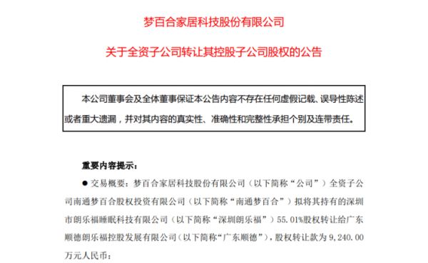 2022年6月9日,梦百合(603313.SH)发布关于全资子公司转让其控股子公司股权的公告。为加快现有业务板块的梳理以及优化资产结构,梦百合的全资子公司南通梦百合股权投资有限公司(以下简称“南通梦百合”)拟将其持有的深圳市朗乐福睡眠科技有限公司(以下简称“深圳朗乐福”)55.01%股权转让给广东顺德朗乐福控股发展有限公司(以下简称“广东顺德”),股权转让款为9240万元人民币。