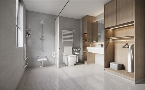 (鸿扬根据老年人特点,鸿扬适老卫生间设计有沐浴凳、报警器、起蹲扶手等)