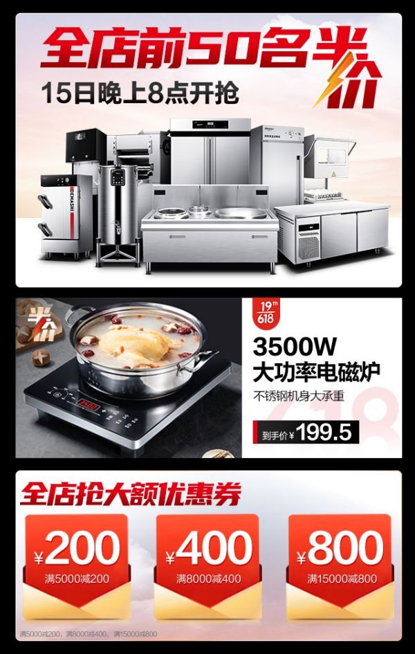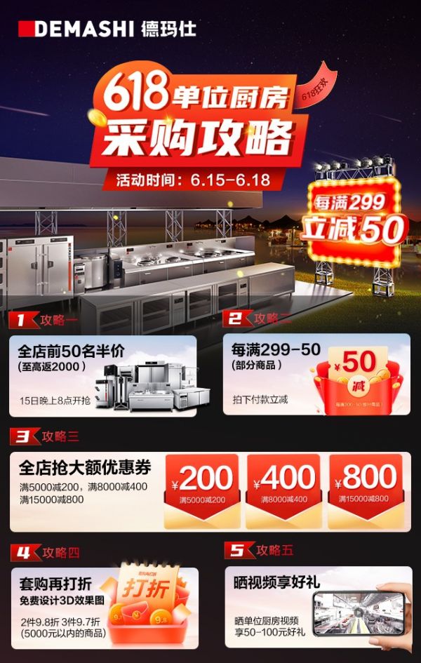 活动期间,德玛仕品牌线上各大官方旗舰店的部分产品可享受每满299减50的福利,拍下付款立减,力求让各大企事业单位都能用上质优价美的厨房设备!