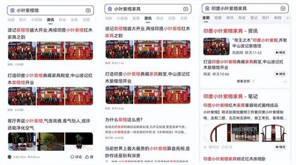 比如:如果消费者想购买小叶紫檀红木家具,就可以在百度输入“小叶紫檀家具”“小叶紫檀馆”等关键词,看看平台会优先和集中推荐哪些品牌。