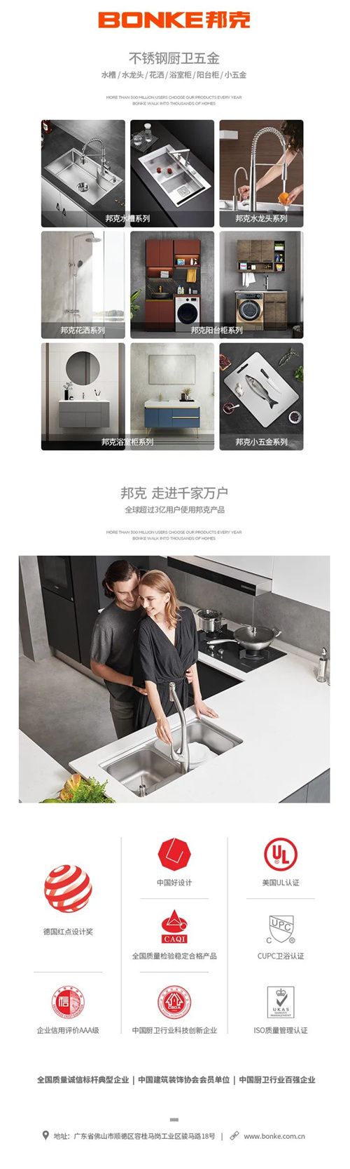 随着人民消费水平的不断提升,厨卫五金产业不断沿着规模化、专业化、国际化的方向发展,邦克厨卫逐渐走出了一条从制造到创造的发展之路,逐步实现多元化发展和数字化智能制造转型。