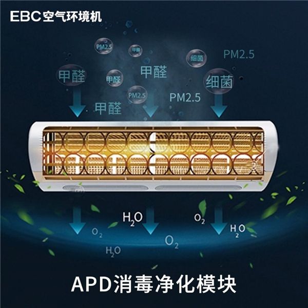 EBC空气环境机采用专利APD消毒净化模块,新风经过初效过滤后,进入APD消毒模块,通过高能电子,破坏细菌细胞结构和病毒蛋白分子,持续高效灭杀细菌病毒,杜绝空气隐患。APD净化模块通过微孔静电吸附技术,长效过滤PM2.5、花粉、柳絮、宠物毛发等颗粒物污染物及过敏源,守护呼吸健康。O耗材,杜绝二次污染,后期维护简单。