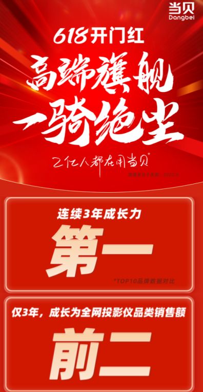 在今年618开门红当贝投影一骑绝尘!开售15分钟!超过去年6.1开门红全天,并获3年连续成长力TOP1品牌,以及全网投影仪品类销售额前2。