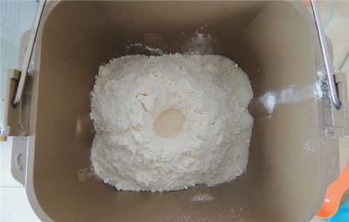4、将一小勺酵母直接倒入然后再用面粉盖好,但不及让酵母接触到盐与糖,酵母死了一般就发不了。