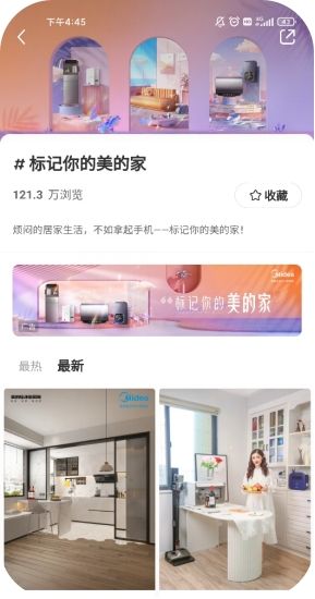 “烦闷的居家生活,不如拿起手机——标记你的美的家!”这句slogan通过朴素的文字道出了人们的居家近况,让看到话题的人不禁眼前一亮:居家生活也可以过得有滋有味!除此之外,话题页的精巧设计也在入驻小红书的家电品牌中独树一帜:粉紫色系的运用与小红书精致人群的画像完美契合,同时,借云朵和水池等元素也让美的厨热“轻松、养护、鲜活”等品牌心智深入人心。在与用户居家心理共情的基础上,运用高级的审美露出产品,足以让这场整合营销深入人心,因此,带来百万浏览的数据也在情理之中。