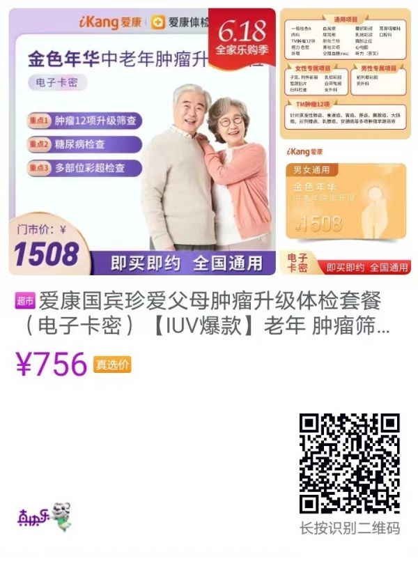 爱康国宾中老年肿瘤升级体检套餐,涵盖12项肿瘤升级筛查、糖尿病检查及多部位彩超检查,覆盖全面更安心。套餐原价1508元,5折直降后,真选价仅756元,如果领券满1000元减100,再叠加满200元减35元福利,还能再享福利,真低价即可送爸爸一份健康大礼。
