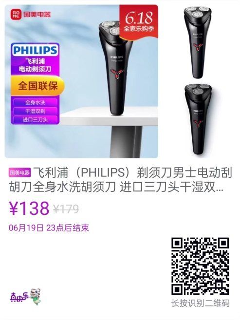 飞利浦电动剃须刀,采用瑞典进口钢材,锋利质感,净剃护肤自有一套,让爸爸的“面子”轻松打理,即使出差也有型。这款产品原价179元,真快乐APP抢购价只要138元,就能助力爸爸轻松焕新形象,一秒回归帅气。