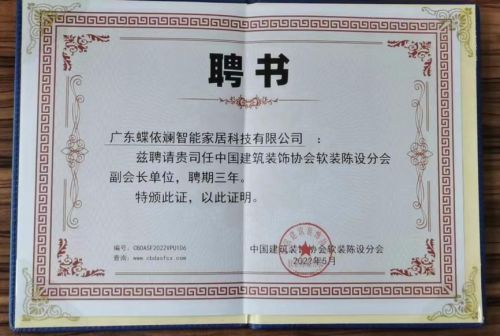 近日,28年品牌蝶依斓家居受聘为中国建筑装饰协会软装陈设分会副会长单位。