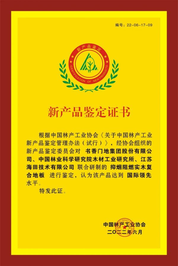 书香门地集团、中国林科院、海田技术关于“抑烟阻燃实木复合地板”科技成果达到国际领先水平