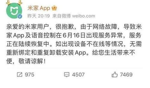 针对“服务器崩溃”、“小爱失联”这一事件,米家官方微博也在第一时间发布声明向用户致歉,称由于网络故障,导致米家 App 及语音控制在 6 月 16 日出现服务异常,服务正在陆续恢复中。如出现设备不在线等情况,无需重新绑定和重复卸载安装 App。