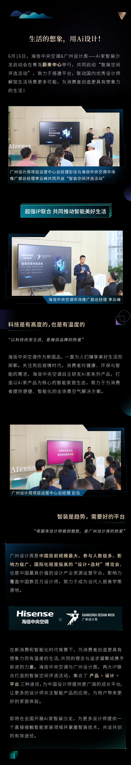 6月16日,海信中央空调&广州设计周—Ai家智装沙龙启动会在青岛蔚来中心举行,共同启动“智装空间评选活动”,致力于搭建平台,联动国内优秀设计师解锁生活场景更多可能,为消费者创造更具有想象力的生活。