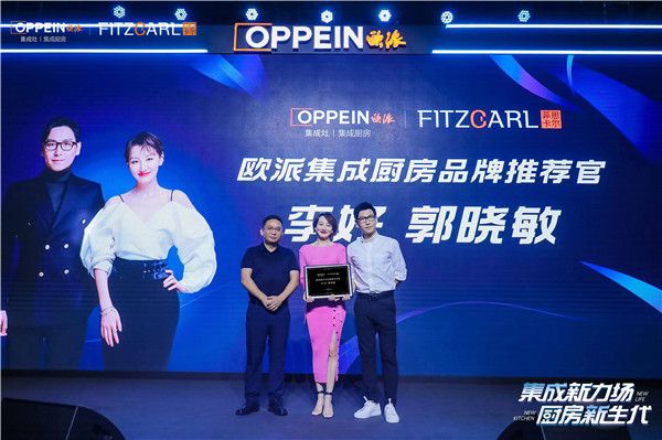 (欧派厨房事业部总经理刘军为李好与郭晓敏授予“欧派集成厨房品牌推荐官”荣誉)
