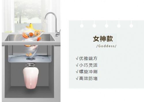 「女神款」一款如女神般优雅的厨余垃圾处理器,外表如樱花绽放,375*235mm的机身,小巧灵活节省空间,方便实用,螺旋冲刷,高效防堵,保护女神的纤纤玉手。