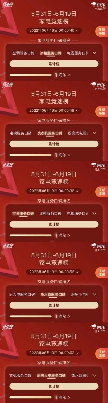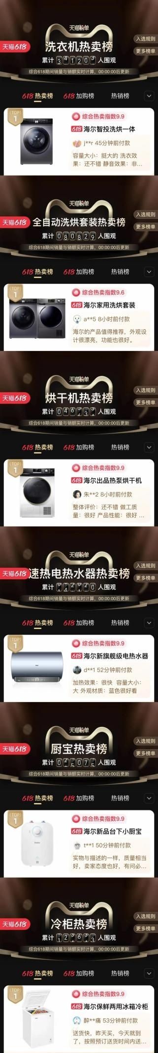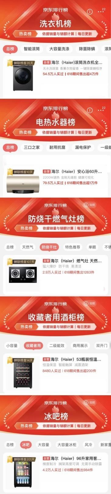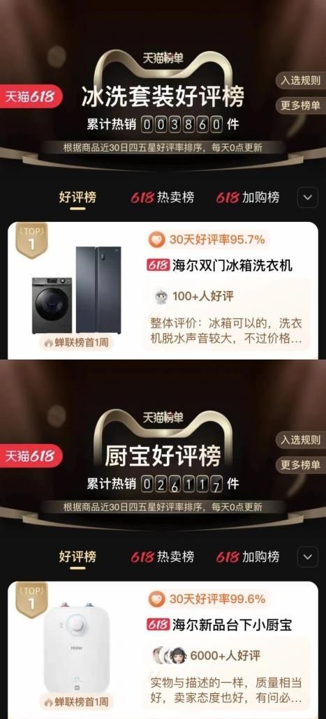 京东冰箱、洗衣机等服务口碑榜居首;京东洗衣机、电热水器等品类热卖榜居首;天猫冰洗套装、厨宝等好评榜居首;天猫冰箱、速热电热水器等热卖榜居首。这些被用户选出来的NO.1,就是对海尔智家最好的认可。