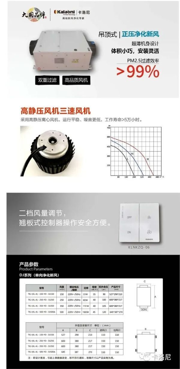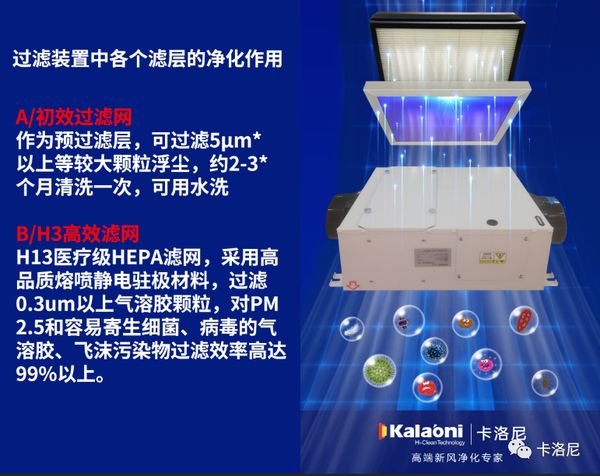 卡洛尼净化型正压新风内置H13级别高效净化滤网,其对颗粒物、气溶胶的过滤能力可以‘秒杀’市场上最好的N95口罩。