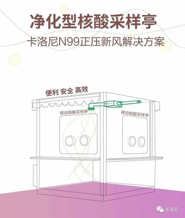 卡洛尼“N99正压新风解决方案”为核算采样人员提供一个洁净卫生的正压安全空间,通过构建隔离的正压空,有效保护内部医护人员的安全,避免其因采样工作而受到感染。
