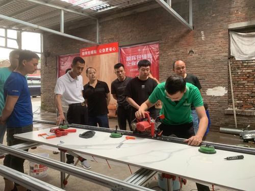 工欲善其事,必先利其器。丰富的理论知识需与实践相结合才能达到更好的效果。实操现场,工匠师傅共同深入研究岩板应用实操技术,并让师傅们亲身体验岩板施工工具的组装、调试、精准切割、倒角的操作流程。
