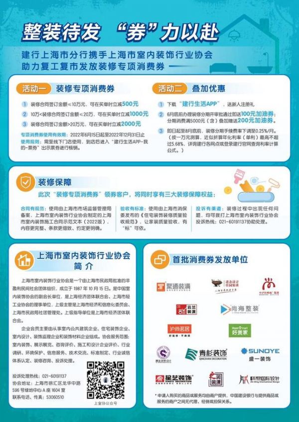 助力上海复工复产,提振消费信心,推动家装市场回暖,2022年6月15日,上海市室内装饰行业协会携手建行上海市分行正式发起“整装待发‘券’力以赴”装修专项消费券活动,通过“建行生活”APP发放“装修专项消费券”定向补贴,让沪上消费者享受实实在在的装修满减优惠,为提升生活品质注入新金融活水。