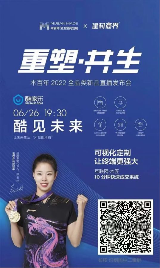 据悉,木百年全卫空间定制将奏响品牌进化的新篇章——6月26日,以“重塑·共生”为主题的木百年2022首场全品类新品直播发布会将震撼启幕,面向行业宣告品牌“全卫定制”步伐又前进了一步,同时,也为广大卫浴商家创造合作的平台和机遇,为经销商创造更高价值。