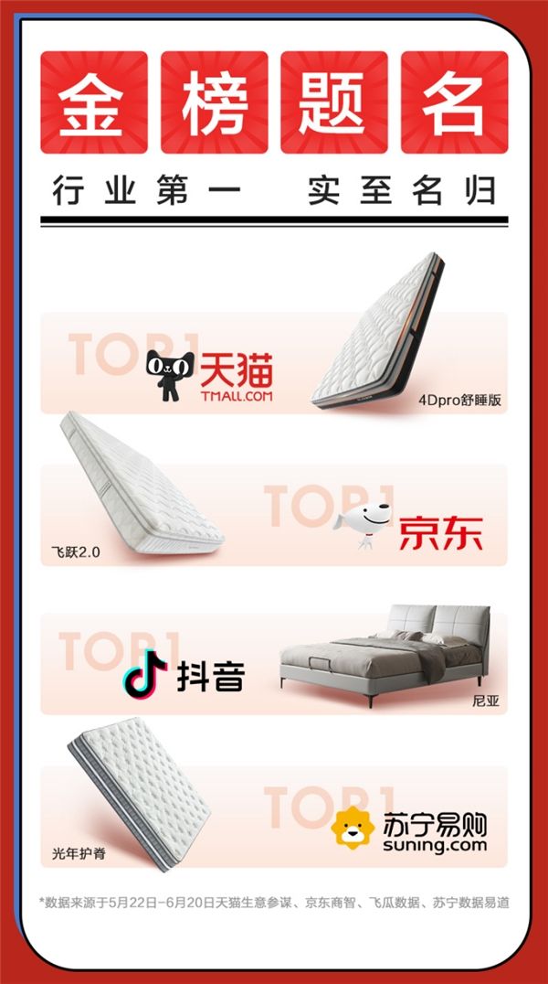在这场年中盛典中,床垫品类赛道行业集中度走高的趋势愈发明显,其中“中国床垫第一股”喜临门于天猫、京东、苏宁、抖音平台再夺销冠,连续8年领跑床垫类目。