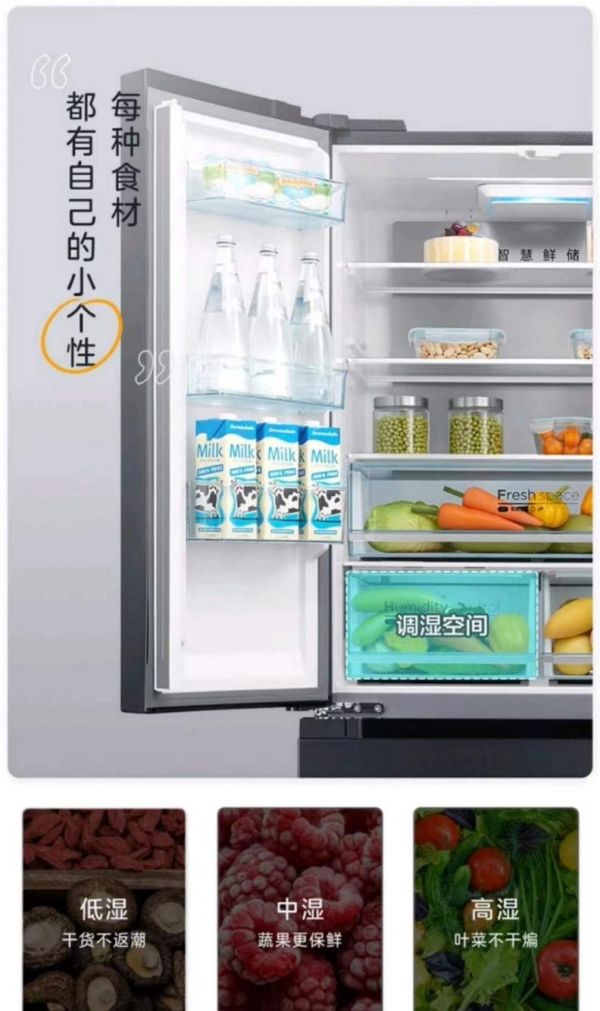 美的净味冰箱可自由分储的大空间,彻底解决了食材混杂存放的问题,果蔬室、冷藏室、调湿、变温空间、冷冻室等,不同食材,不同的储放空间。如调湿空间,可实现高湿、中湿、低湿三档,木耳、枸杞等放低湿,不返潮;果蔬放中湿更保鲜。
