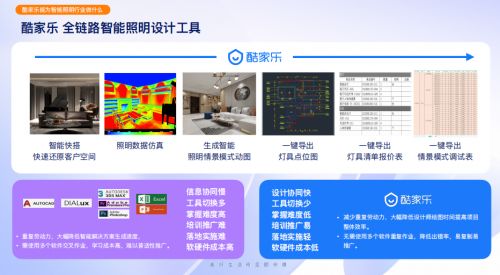 酷家乐Koolight·智能照明解决方案切入照明行业的营销获客、设计拿单、下单订货、调试安装、交付备案等全流程,基于照明行业的实际打光场景,通过设计全链路线上化,赋能照明设计人群提效增收,助力厂商渠道营销体系升级,满足大众日益增长的个性化、智能化、场景化照明需求。