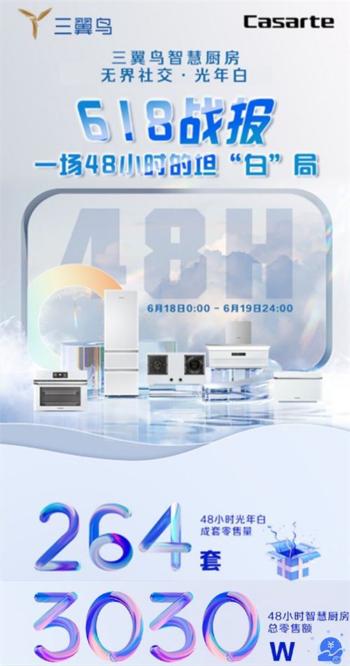据悉,该口碑榜单涉及销售过程、安装交付、产品质量、售后服务等4大维度,调研样本超50多万份,是用户口碑的直接体现。而此次618期间,三翼鸟厨房就凭借好口碑、好体验得到了全国市场的认可:6月18日0时-6月19日24时,新推出的三翼鸟厨房“光年白”套系48小时就成交264套,带动智慧厨房总销额超3030万,为4620个意向用户带来成套饮食服务,实现了用户口碑、市场业绩双增长。