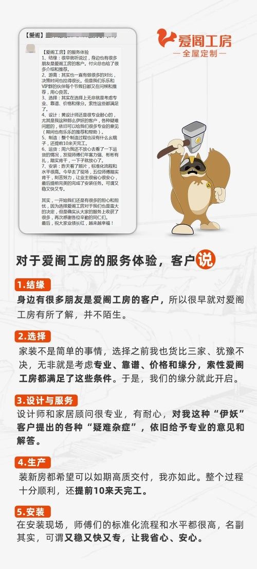 用真诚服务获得邻居们的认可和支持。万千来自于客户的好评是对爱阁工房的最高褒奖,同时也是爱阁人前进的动力,时刻激励着大家为客户带来更好的服务与全屋定制体验之旅。