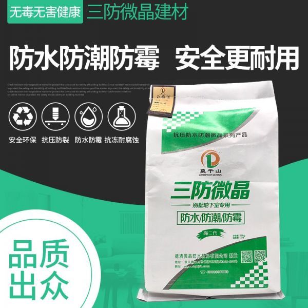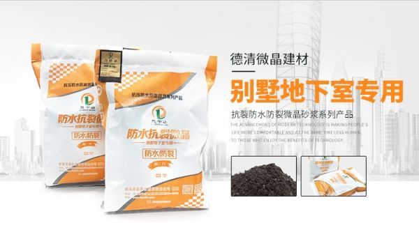 德清微晶则是一种新兴的高科技防水材料。这种防水材料由公司联合多所大学的地下建筑和工程系一起研发。这种材料能够在水泥的水化过程中形成有自粘性和粘结性的高强度微晶体,同时排出多余的水分、封闭砂浆和混凝土内部的毛细通道和裂缝等。经过这样的变化,水泥石和骨料就会紧密地结合在一起,与混凝土和砂浆变为一体。如果遇到潮湿或者其他水环境,德清微晶则会再次水化,使砂浆和混凝土的强度进一步得到增强。德清微晶无毒、无害、无污染,且施工过程简单,只需要掺入水泥即可,有效期长达20年,是真正的“一次施工、一劳永逸”,有效改变了其他防水材料需要定期维护的弊端。