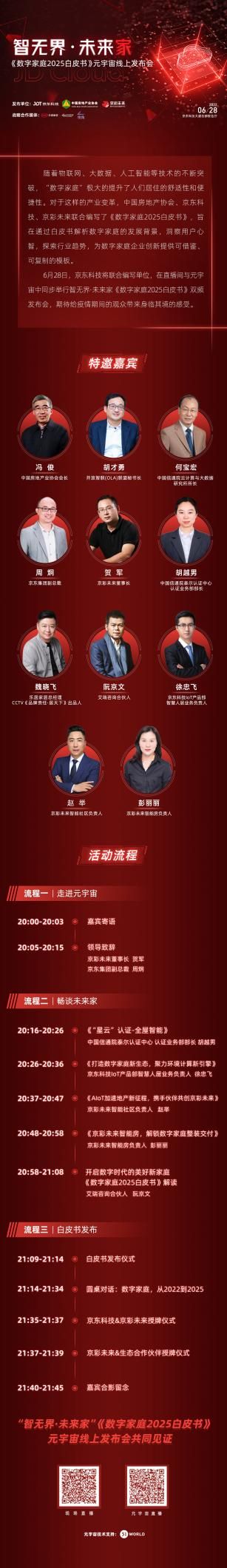 6月28日晚20:00-22:00,京东科技联合中国房地产业协会和京彩未来举办智无界·未来家《数字家庭2025白皮书》元宇宙发布会,邀请到中国房地产业协会会长冯俊,开放智联(OLA)联盟秘书长胡才勇,中国信通院云大所所长何宝宏,京东集团副总裁周炯,京彩未来董事长贺军,中国信通院泰尔认证中心认证业务部部长胡越男,乐居家居总经理、CCTV《品牌责任·居天下》出品人魏晓飞、艾瑞咨询合伙人Michael阮京文、IoT产品部智慧人居业务负责人徐忠飞、京彩未来智能社区负责人赵举、京彩未来智能房负责人彭丽丽,对当前中国数字家庭市场进行全方位解读。