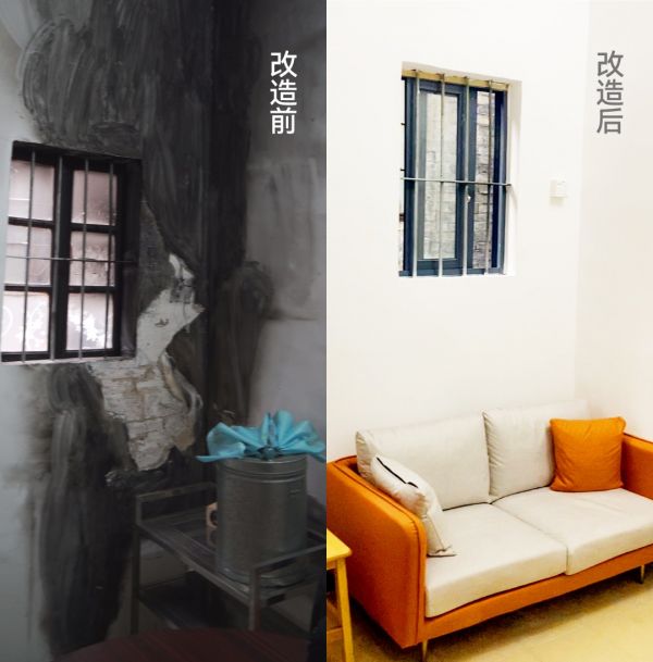 铲掉一楼的墙皮,刷腻子,墙体找平,刷上白白的油漆;拆除楼梯腐朽木板再安装上牢固的金属扶手,排除一切潜在危险;给二楼小厅做好吊顶,仓库做好棚顶梳理好电路,把仓库“变身”成小辉的小房间~
