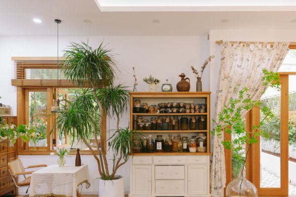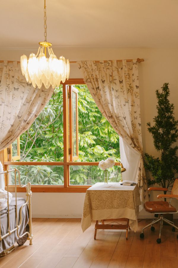 有一种美好的生活范式叫如处“小森林”的中间状态。后花园的植物香气吸引着人推门而出,脚踩花砖,有种异域风情。卧室有一扇框住了绿树的窗,叶子扑闪扑闪的,伸手就能摸到它似的,就感觉自己像跌入了绿树的怀抱,真的是名副其实的住在森林里。