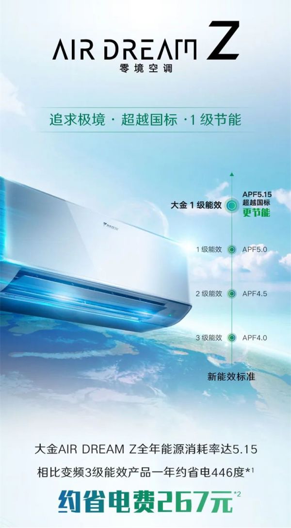 很多人选购空调时都会参考空调上面的“能效标识”贴纸,根据“能效”等级判断空调的耗电量。绝大多数人不知道的是:“能效标识”中APF值的高低也是决定空调耗电程度的重要指标。大金空调AIRDREAM Z秉承着先进的变频技术,APF值达到5.15,超越国标一级能耗标准,以技术创新推动节能减碳。