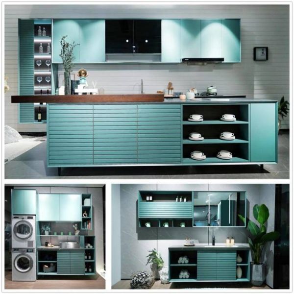 橱柜中置一字型岛台,有着与晨雾绿融为一体智能电动平移岛台黑科技,让台面下的升降龙头和水槽,得以完全隐藏在烹饪区中。简单优雅的指令,便能实现智能移动岛台自动平移打开。独有的“智慧窗”设计,智能玻璃滑翔柜,一键开启晶莹的灯光氛围和储藏空间,时尚便捷,人性化。