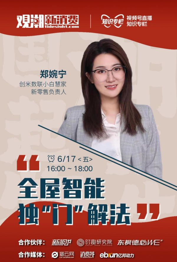 近日,智能家居品牌创米科技旗下的【小白慧家】新零售负责人郑婉宁,做客观潮新消费直播间,深度探讨智能家居话题。观潮新消费一直在密切观察潮流趋势的新兴产业和新锐国牌的商业案例。近两年具有千亿级市场规模,且年复合增长率达到35%以上的智能家居产业炙手可热。创米科技作为这场产业新浪潮里的头部企业,被邀请参加主题为“全屋智能独门解法“的直播对谈。