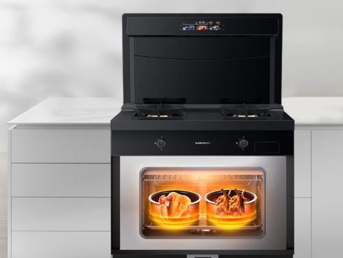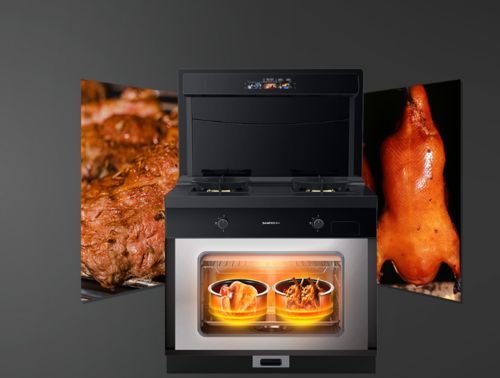 以帅丰S6-7BK-90一腔双烤集成灶为例,这款集成灶除了拥有灶具、烟机的基本功能外,还同时拥有了蒸箱和烤箱。它采用的是蒸烤一体的设计,内胆部分选用了更耐磨更耐高温的纳米钛金材质。并且它能够支持一腔双烤,烹饪的时候可以同时在烤箱内放入两个烤锅,左边烤西兰花,右边烤鸡翅,提升烘烤效率的同时还不用担心串味的问题。