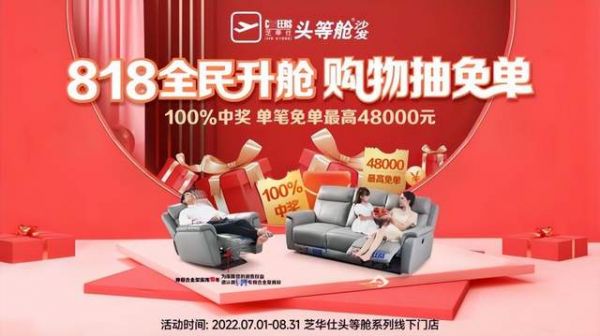 在今年7月至8月,芝华仕将开启专属品牌狂欢节,818全民升舱日,全屋11件套13998元,轻松打造幸福家,还有重磅抽免单,最高可免4万元!每一届818全民升舱日,芝华仕都拿出最大诚意让利给消费者,让全国家庭都能够轻松升舱,把芝华仕沙发带回家,享受头等舱生活方式!